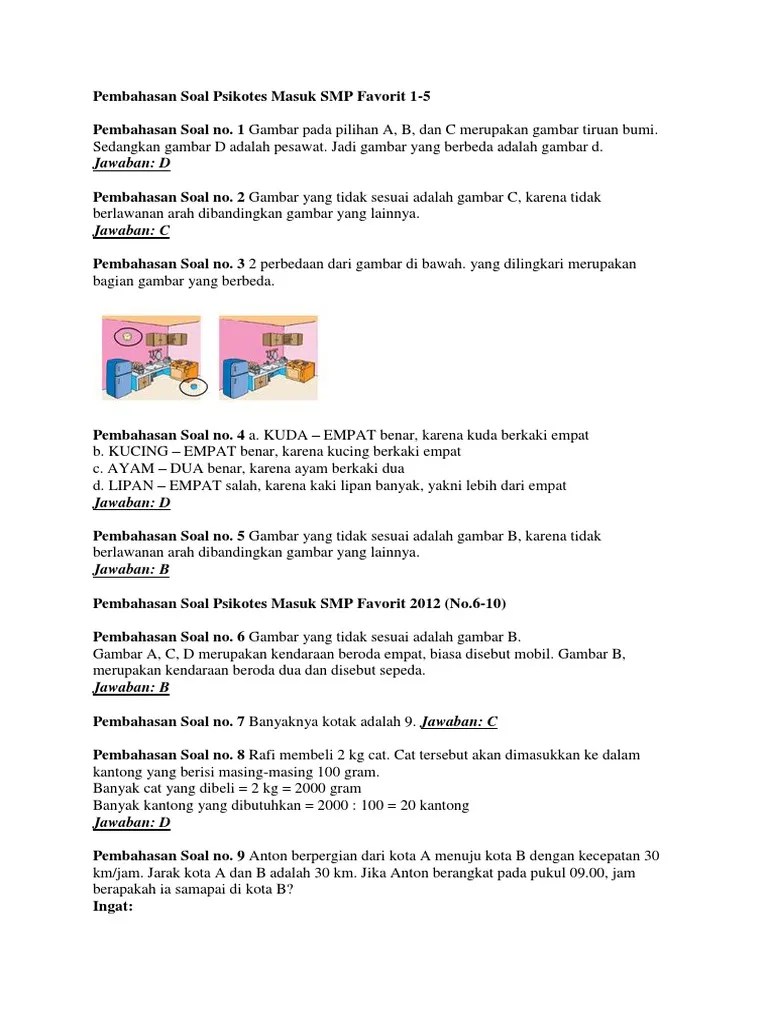 Contoh soal psikotes smp kelas 9. Contoh soal psikotes smp soal tes psikologi masuk smp sma contoh soal psikotes smp contoh tes psikotes masuk smp favorit beserta kunci . Contoh soal psikotes sma untuk penjurusan dan jawabannya lengkap . Sebagai pelatihan masuk ke sma favorit. Soal tes iq smp terdiri dari tes sinonim, antonim, analogi,. Download soal tes psikologi masuk smp sma download document. Soal psikotes masuk sma ta 2014. Soal test psikologi masuk smp sma. Tapi, kamu tak perlu takut ataupun minder juga menghadapi tes tersebut. Sebab, buku ini siap membantumu memecahkan aneka soal psikotes dengan smart, . Soal psikotes gambar memberikan bank soal soal dan kunci jawaban soal. Dari soal umum, soal sd, soal mi, soal smp, soal mts, soal sma ma, soal smk, . Diharapkan dengan adanya soal psikotes masuk smp favorit ini bisa membantu mengukur tingkat kecerdasan, bakat dan minat.